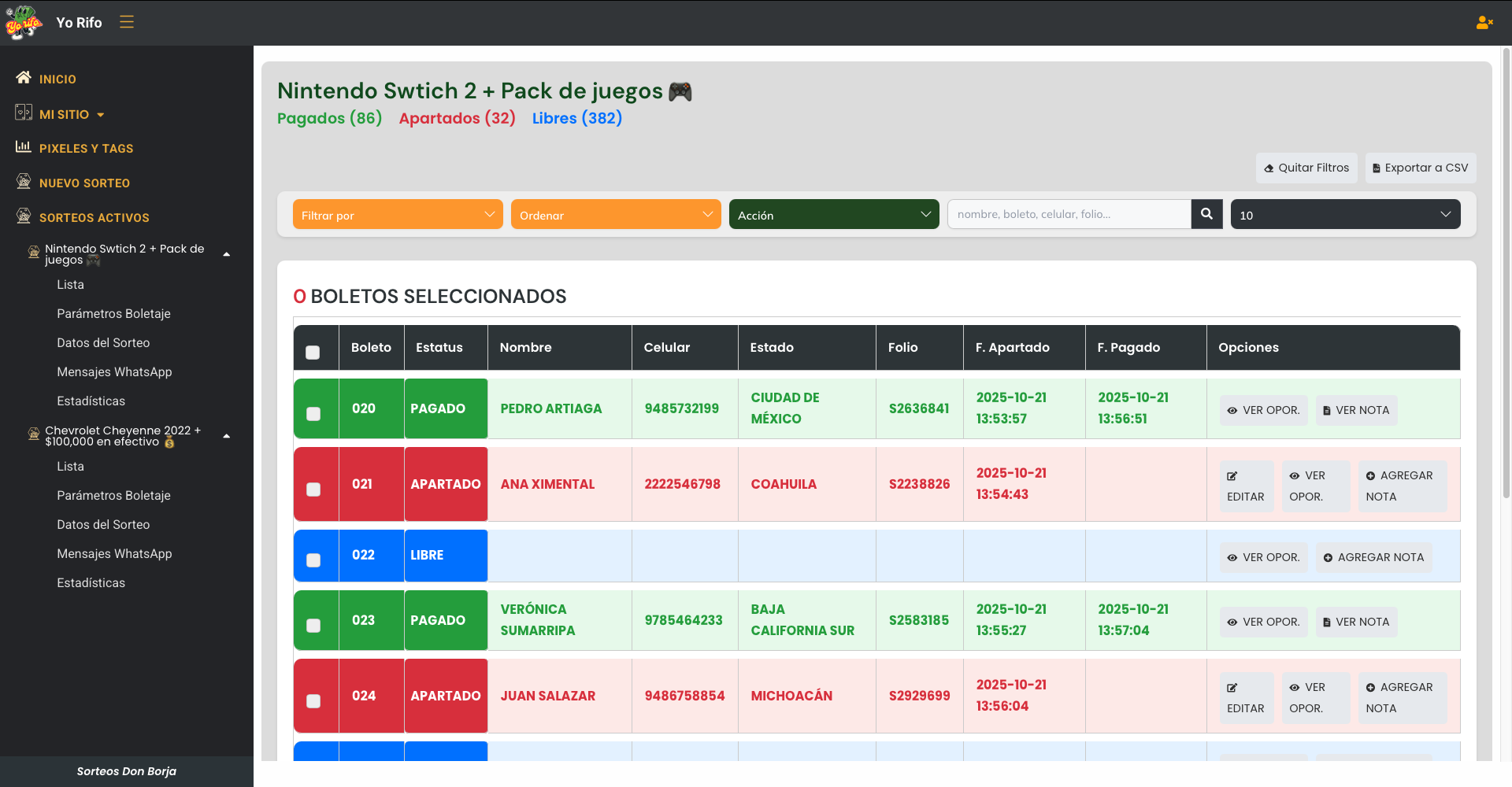 Control total de tus sorteos en un solo lugar: localiza boletos en segundos, actualiza datos de tus participantes, agrega notas estratégicas y comunícate al instante por WhatsApp para cerrar más ventas.