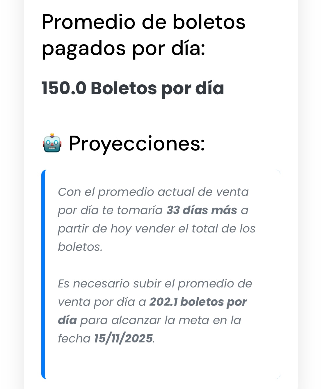 Visualiza el progreso de tus ventas, conoce cuántos boletos debes vender cada día para alcanzar tu meta y recibe proyecciones precisas gracias a nuestra inteligencia artificial.
