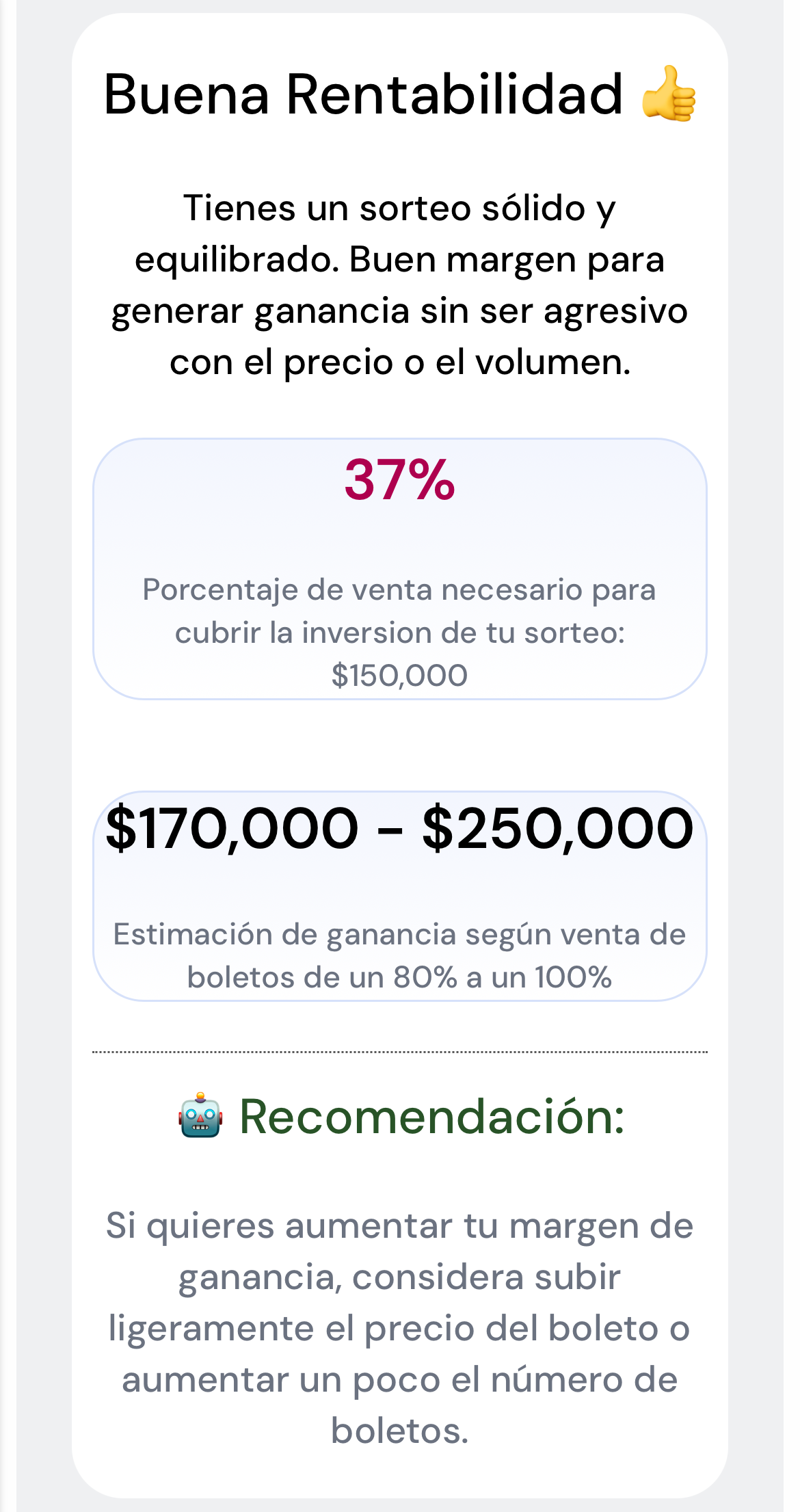 Basado en el costo del boleto, número de boletos, inversión y premios, nuestra inteligencia artificial analiza y calcula la rentabilidad de tu sorteo antes de lanzarlo.