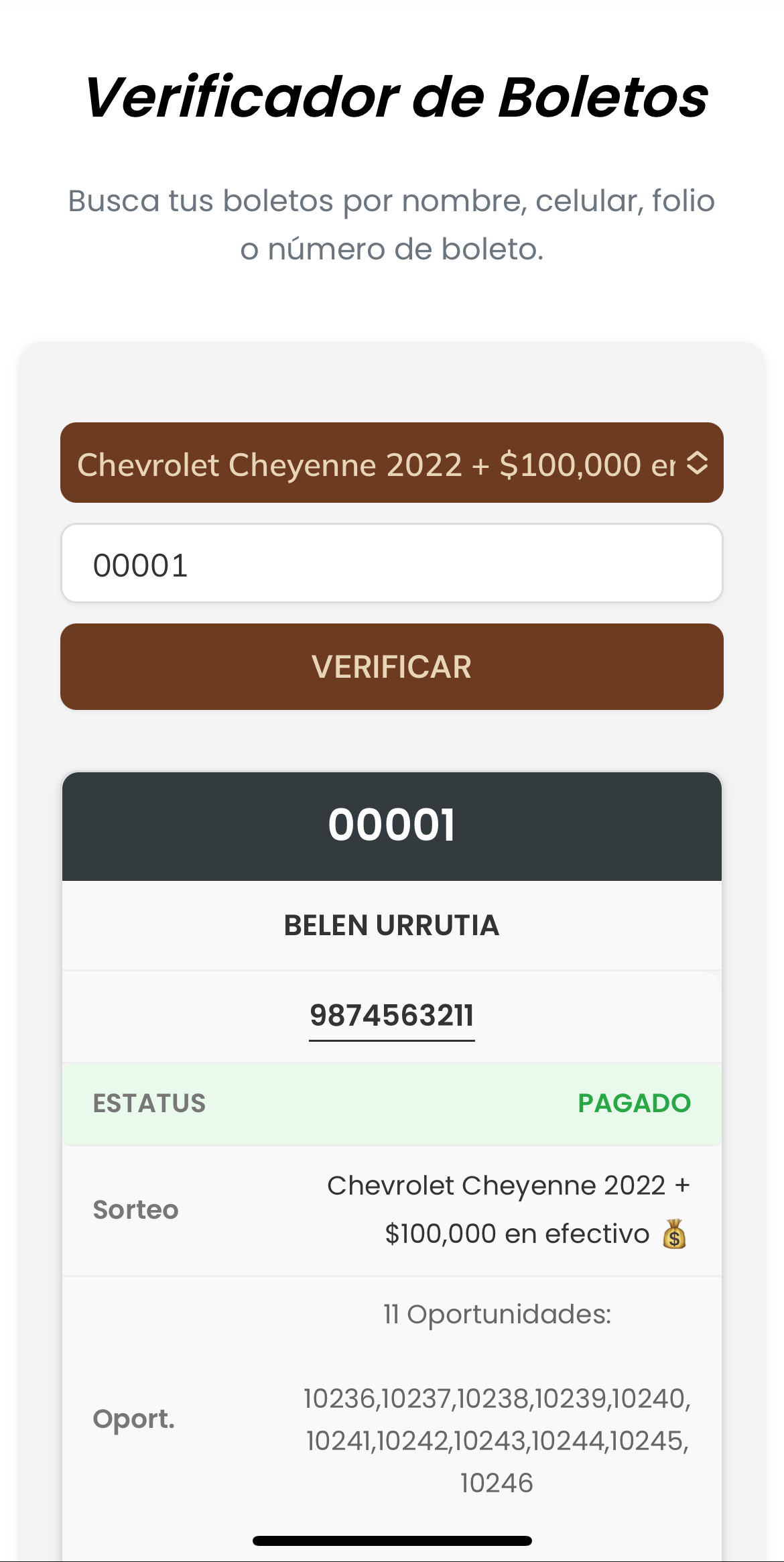 Con el verificador de boletos tus jugadores podrán buscar sus boletos por nombre, número, teléfono o folio, y ver al instante el estatus de su participación.